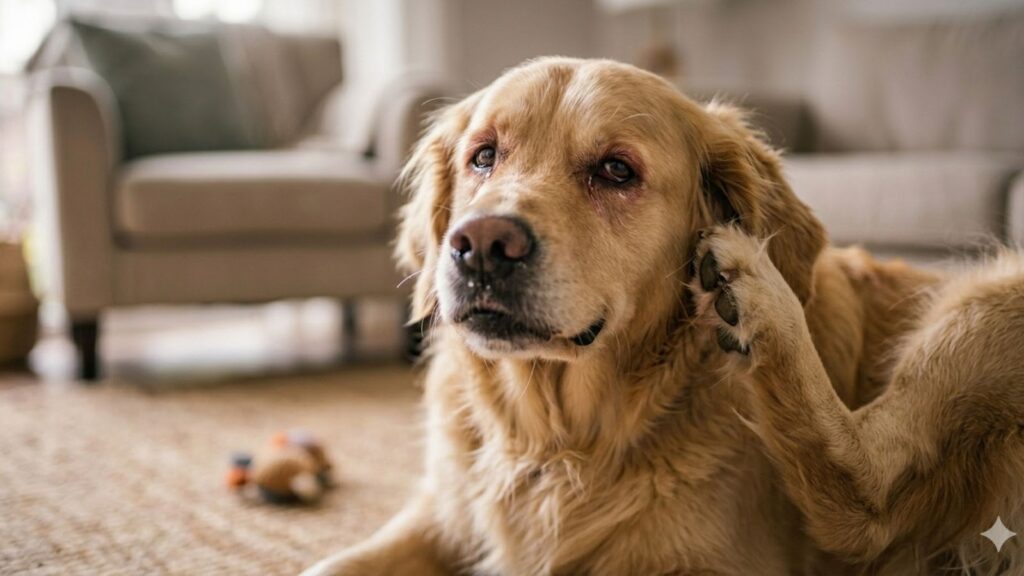 足先や脇、内股などをしきりに舐めたり、同じ場所を繰り返しかきむしる様子が見られます。また、目の充血や涙の増加、顔を床や前足にこすりつける行動が見られることも珍しくありません。